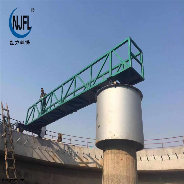 工作橋是全橋式結構,雙邊驅動,工作橋可以承受(shòu)負荷大(dà)於250kg/m2 ,具有足夠的強度 ,橋架一端(duān)支撐安裝在沈(chén)澱池中心混凝土支柱上的中心轉軸(zhóu)機構上,一端(duān)靠鋼(gāng)制(zhì)滾輪支撐在混凝土池壁上的鋼(gāng)軌上行走。