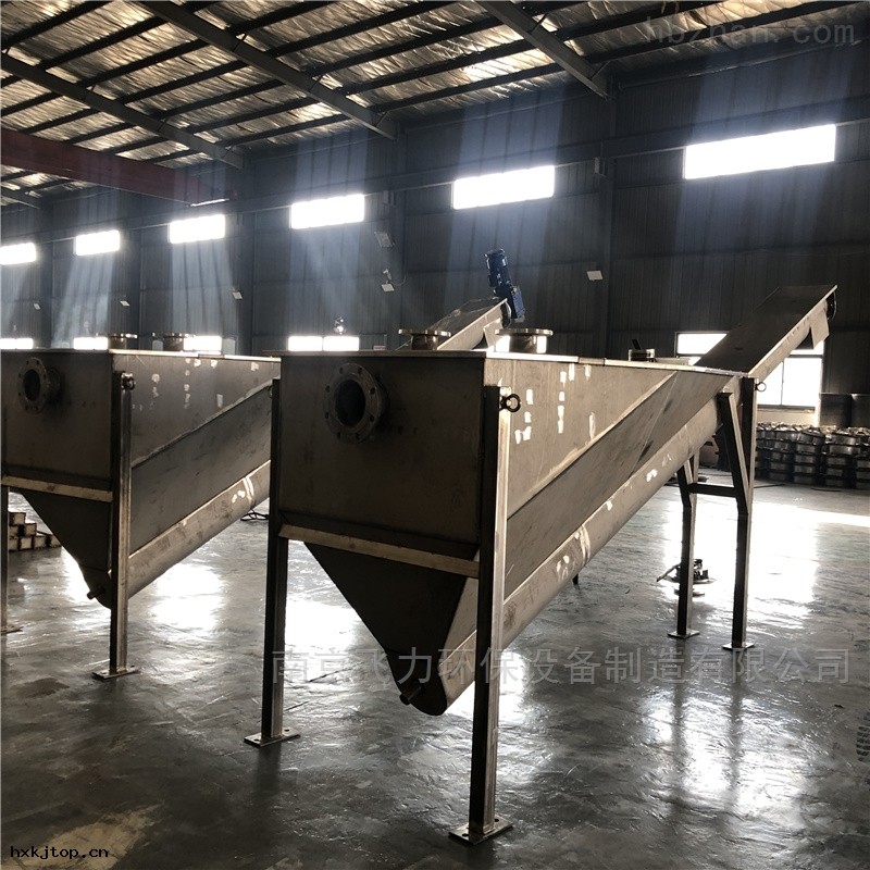 ,混合(hé)液中重度(dù)較大的,如砂粒等將沈積於槽型(xíng)底部,在螺旋的推動下(xià),砂粒沿斜置(zhì)的槽底提(tí)出(chū)升,離開液面後(hòu)繼續推移一段距離,在砂粒充分脫水後(hòu)經排砂口(kǒu)卸(xiè)至盛(shèng)砂桶