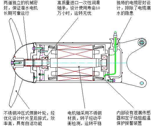 由於潛水攪拌機(jī)是長期在水下運行,所以密封性(xìng)尤為重要 ,飛力環(huán)保(bǎo)潛水攪拌機(jī)*的電纜密封設計(jì) ,排除了(le)電纜漏水的隱患(huàn)。機(jī)械密封材質(zhì)均使用耐(nài)磨耐(nài)用材質(zhì) ,增加使用壽命。第二(èr)道機(jī)械密封存在於油室內 ,油室是防止介質(zhì)從泵軸進入電機(jī)內部的一層屏障(zhàng) ,密封必須要做好(hǎo) ,飛力環(huán)保(bǎo)採用兩道密封層層防護 ,而(ér)且我們(men)的電機(jī)內部設有(yǒu)洩漏傳感器(qì)和定子繞組超溫保(bǎo)護報警裝置 ,可以更加安全(chéng)的保(bǎo)護好(hǎo)我們(men)的主機(jī)電機(jī) 。