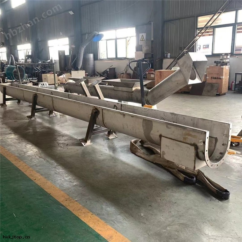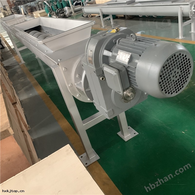 粗顆粒(lì)WLS無軸螺旋輸送機是通過電(diàn)動(dòng)機帶動(dòng)擺線減速(sù)機運(yùn)轉的,靠機械密封軸與(yǔ)無軸螺旋體上的連接(jiē)盤傳動(dòng)而(ér)使螺旋旋轉工作 ,當污泥排到U形槽上部的進料口後,即通過螺旋傳動(dòng)使污泥由U形槽下部的出料口排出。工作中污泥就像(xiàng)不動(dòng)的螺母 ,而(ér)無軸螺旋則像(xiàng)轉動(dòng)的螺栓 ,螺栓連續旋轉即可驅使螺母從一端移至另一端 。一台(tái)水平(píng)安裝的無軸螺旋輸送機可同時收(shōu)集(jí)兩台(tái)壓濾機和(hé)一台(tái)離心機處理的污泥,並輸送至下一工序。