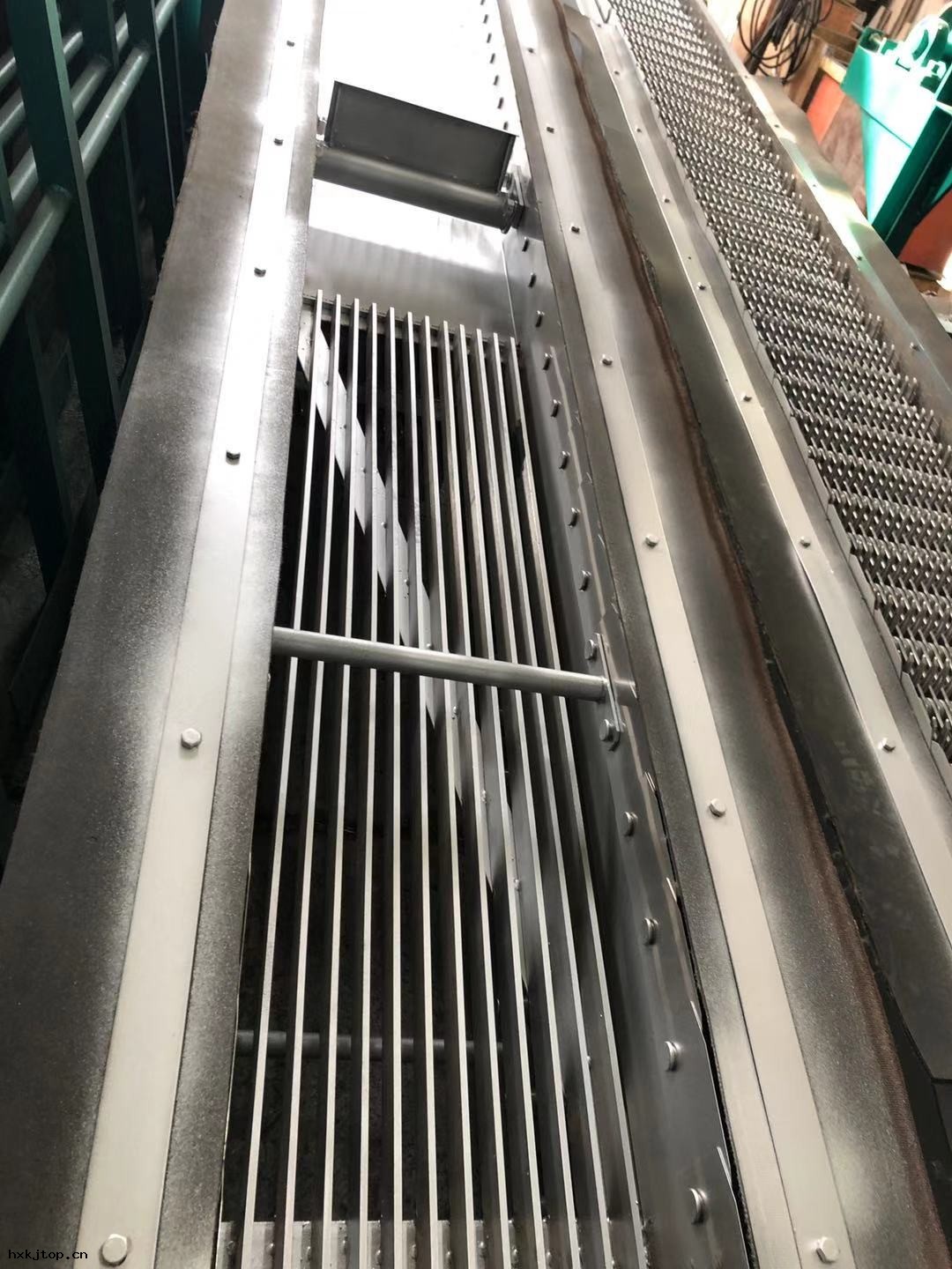 該設(shè)備是由ABS工程塑料 、尼龍或不鏽鋼成(chéng)的特殊形耙齒 ,按一定的排列次序裝在耙齒軸(zhóu)上形成(chéng)封閉式耙齒鏈,其下部裝在進水渠水中 。當傳(chuán)動系統帶動鏈輪作勻速定向旋(xuán)轉(zhuǎn)時,整個耙齒鏈便自(zì)上而下運(yùn)動 ,並攜帶固體雜物從液體中分(fèn)離出(chū)來 ,流(liú)體通(tōng)過耙齒間(jiān)隙流(liú)出(chū)去,整個工作狀態連續進行 。 由於耙齒的特殊結構(gòu)形狀,使耙齒鏈攜帶雜物到(dào)達上端反向運(yùn)動時,前後(hòu)耙間(jiān)產生(shēng)相對自(zì)清(qīng)運(yùn)動 ,促使雜物依靠重力脫(tuō)落 ,設(shè)備後(hòu)面可(kě)設(shè)置旋(xuán)轉(zhuǎn)的清(qīng)污刷,進一步除淨滯留在耙齒污物 ,如需要(yào)定貨時需注明(míng)。