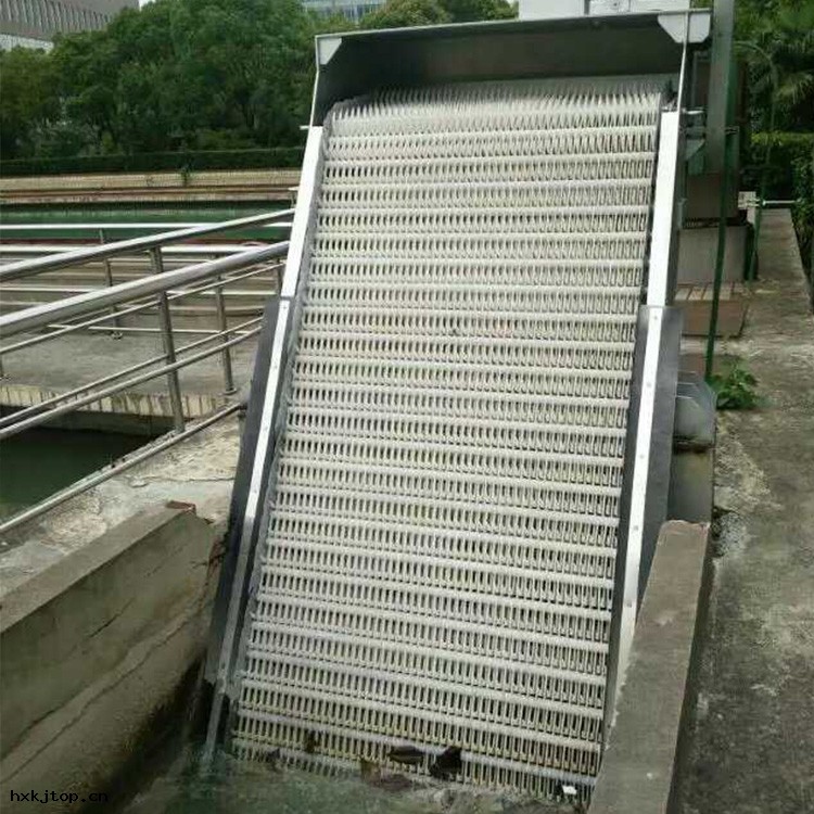 耙齒格柵導輪(lún)後翻轉到柵前迎水(shuǐ)面的(de)位置,繼續運動插入固(gù)定柵條的(de)間隙中上行 ,把柵前攔截的(de)污物提(tí)升帶出水(shuǐ)面 ,並隨著(zhe)鏈(liàn)條的(de)運動到出渣口處自動翻轉 ,污物自卸(xiè)到格柵後的(de)輸送機(jī)或渣桶中,完成除污過程,液體則(zé)通過柵條的(de)柵隙流過 ,整個(gè)工(gōng)作狀態(tài)連(lián)續循環進行。