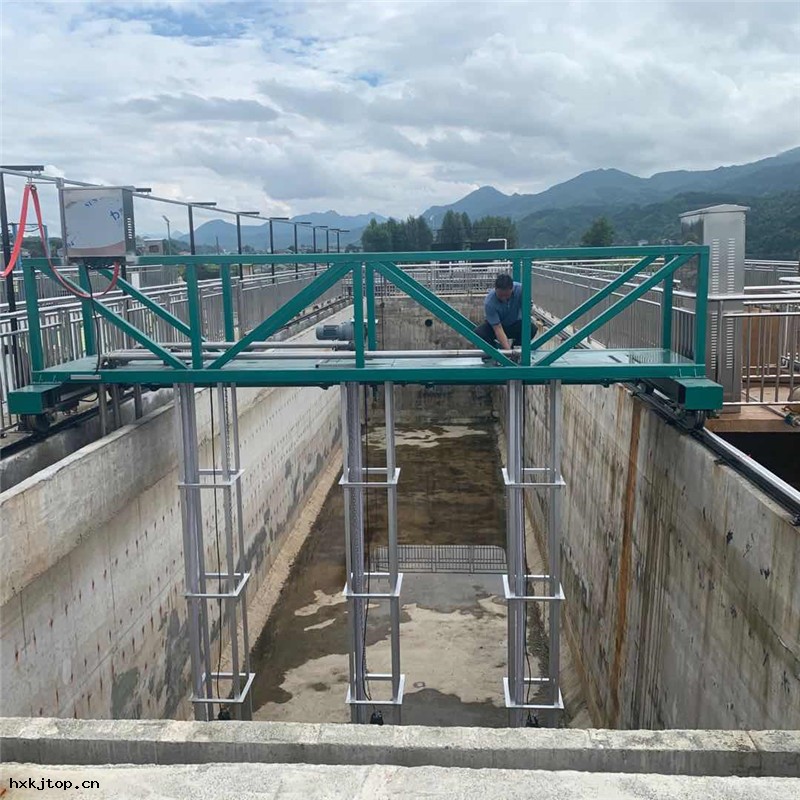主(zhǔ)梁兩端梁上的驅動裝置帶動,沿鋪設(shè)在池頂的軌道行駛